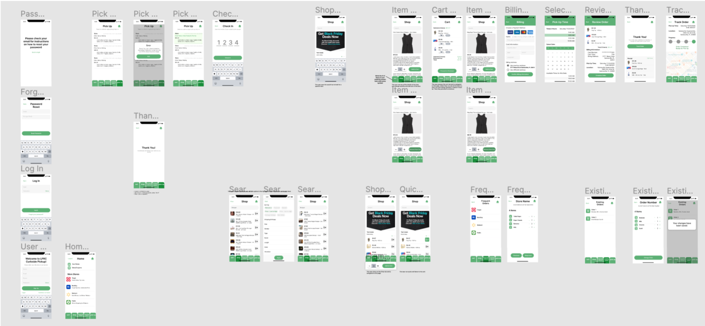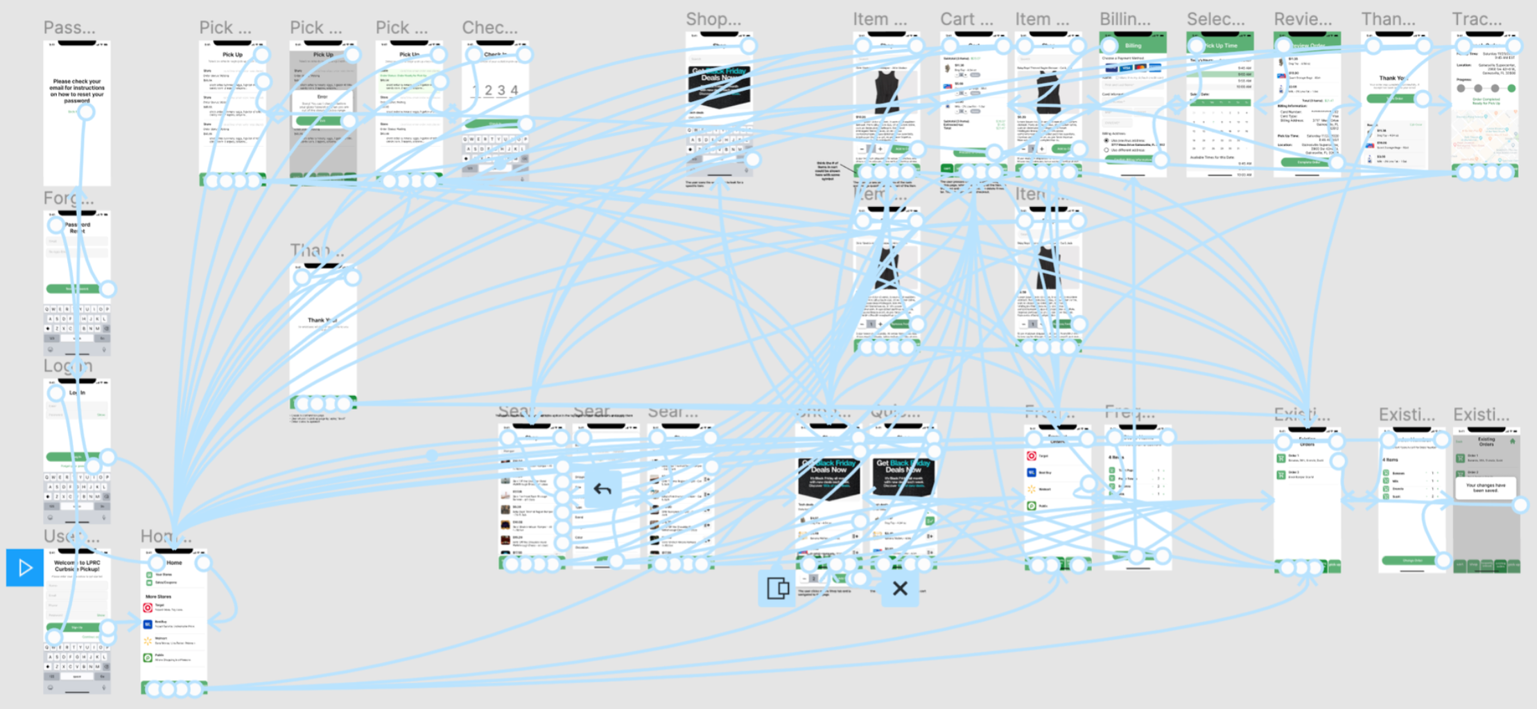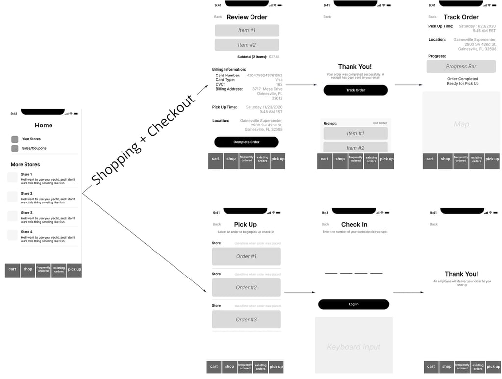 Example of Lo-Fi shopping and checkout flow done before moving on to high-fidelity wireframes.