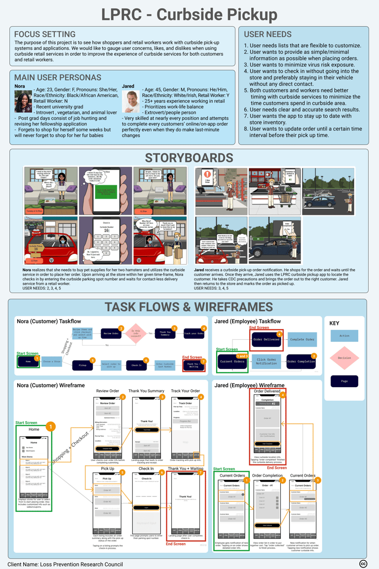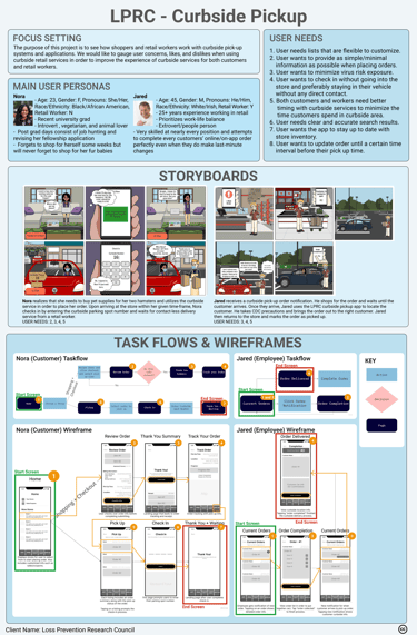 Our team of four UX designers worked with the Loss Prevention Research Council (LPRC) to design an application to streamline the curbside ordering process for their partnered retailers. The application is used by both shoppers and retail workers with an emphasis on safety (especially during COVID-19), convenience, and accurate inventory information. From this project, we learned that a larger data pool for research would have been more beneficial, but, given the time constraint we were given, we did a fairly substantial job gathering evidence to help define the underlying problems we needed to address in our designs.