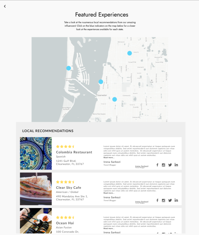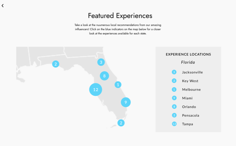 This design removed the need for unnecessary clicks from going around the site trying to find what’s available in each region and instead has all of your options collected under the map for ease of viewing. You could also click on each point on the map to view a “quick summary”, that, if you clicked on, could take you to the individual experience’s page to view all information pertaining to the experience. This also made it scalable for any future additional experiences.